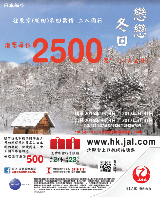 日航JAL繼續減!3月31日前出發!兩件各23kg行李!香港往返東京二人同行每人只需$2,500起,札幌$3,550起 – 日本航空