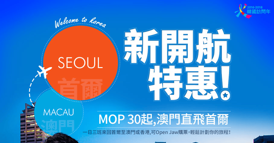 岩岩推出左開航優惠,澳門飛首爾單程只需MOP30起,連稅MOP212,勁抵!