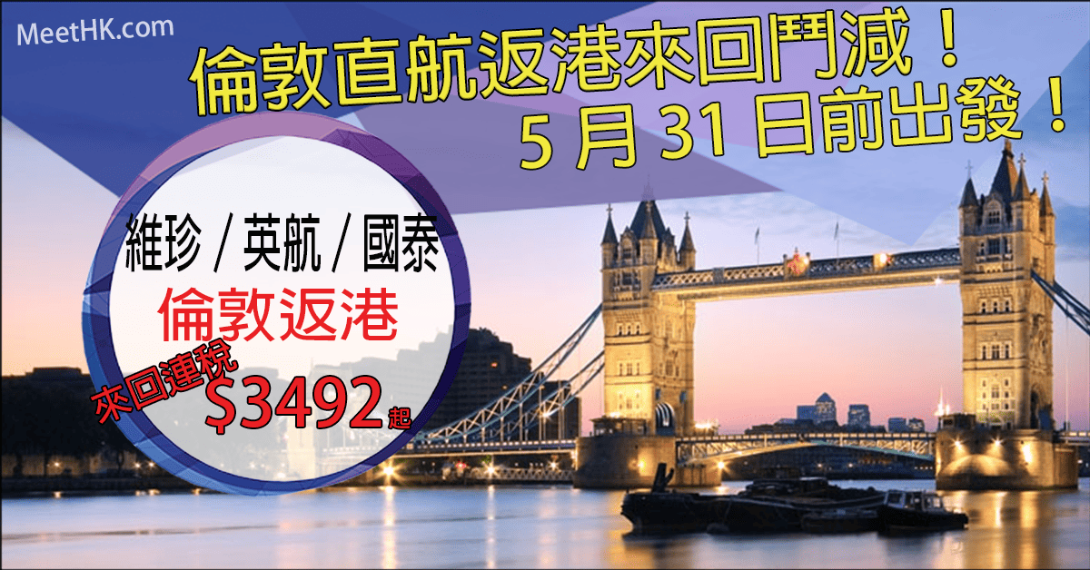 爆抵!倫敦返港齊齊減!明年5月31日前出發!倫敦直航返港來回連稅只需$3,492起 – 國泰航空/維珍航空/英國航空
