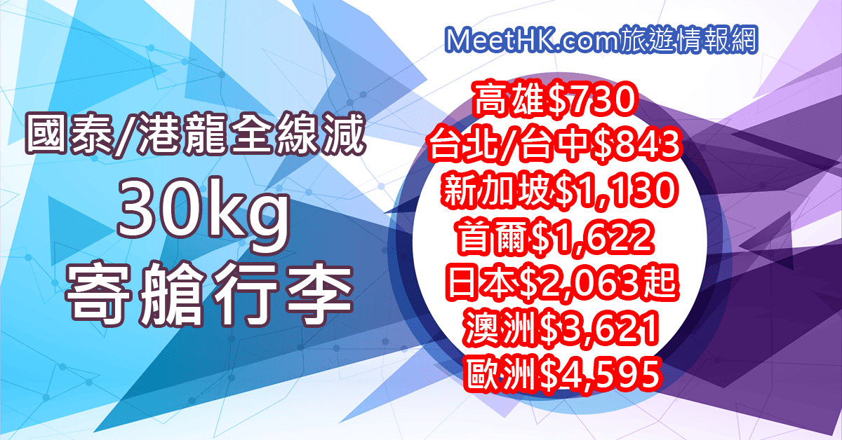 國泰/港龍30kg寄艙行李!高雄$730,台北/台中$843,新加坡$1,130,首爾$1,622,日本$2,063起,澳洲$3,621,歐洲$4,595,洛杉磯$4,041 – Wefly.com.hk (優惠至10月17日)