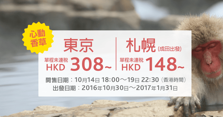 香港經東京轉飛札幌單程只需$456起,來回連稅$1,423起