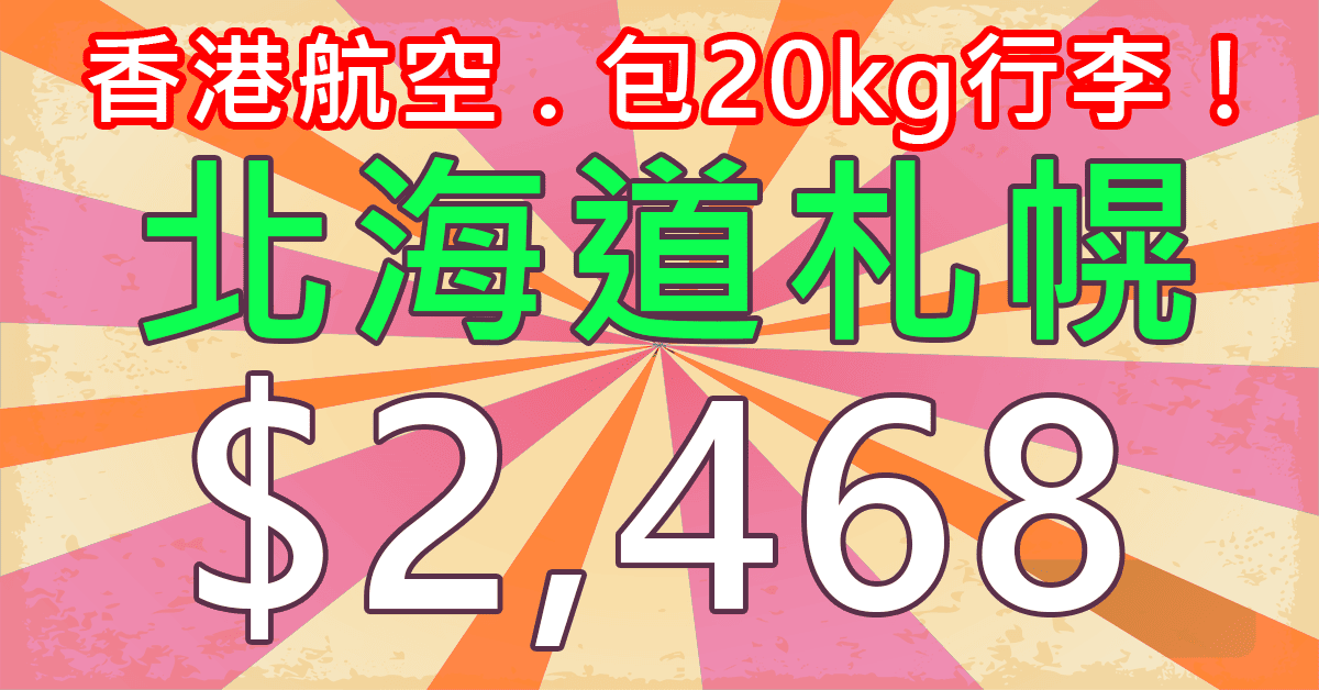 平到難以置信!連稅二千八直飛北海道!12月15日前出發!包20kg行李!香港往返札幌只需$2,468 – 香港航空 (優惠至10月21日)