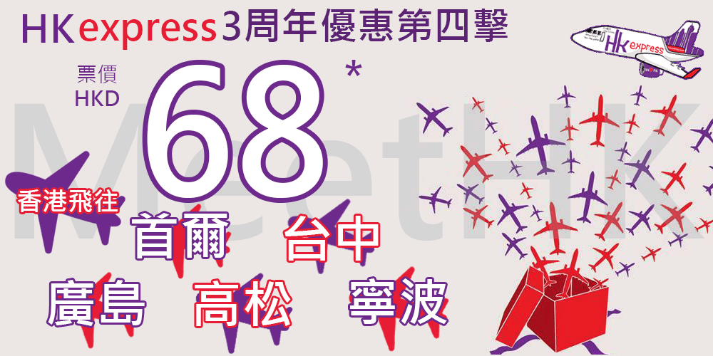 嘩!今晚12點開搶!3周年第四擊$68飛首爾、台中、廣島、高松、寧波 – HK Express (優惠至10月24日)