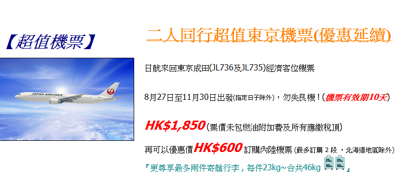 香港往返東京二人同行每人只需$1,850,連埋稅都只係$2,728,比全日空既東京優惠平約$40