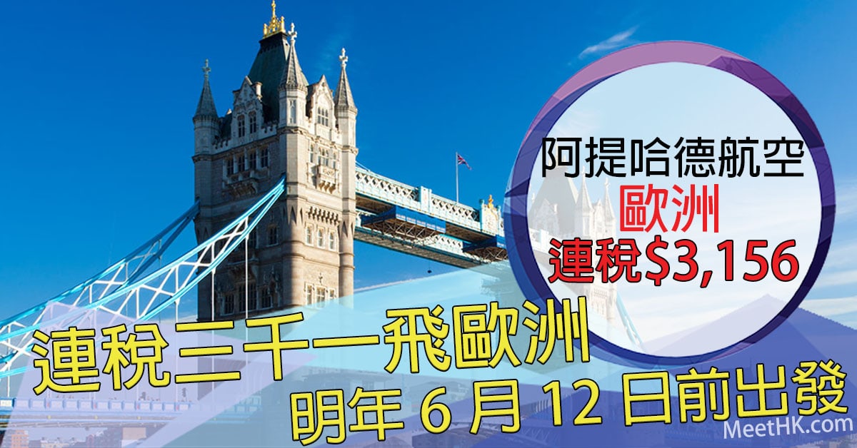 抵呀!連稅$3,156飛歐洲!明年6月12日前出發!香港往返歐洲各地連稅只需$3,156起 – 阿提哈德航空 (優惠至11月14日)