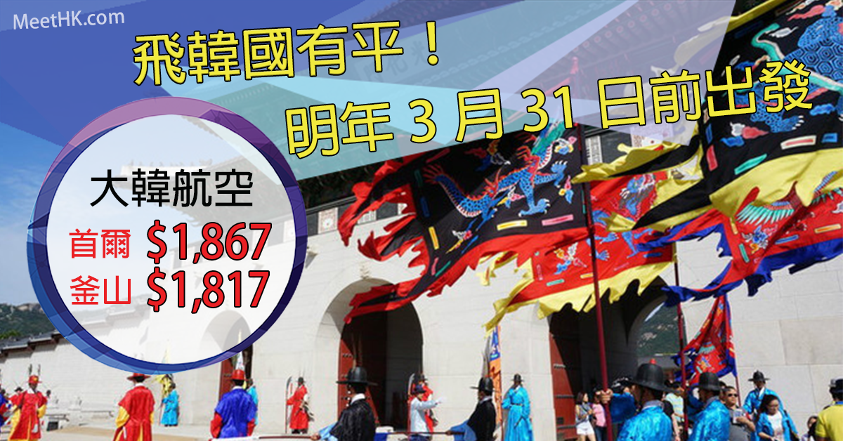 大韓都減啦!明年3月31日前出發!香港往返首爾、釜山只需$1,817起 – 大韓航空 (優惠至12月31日)