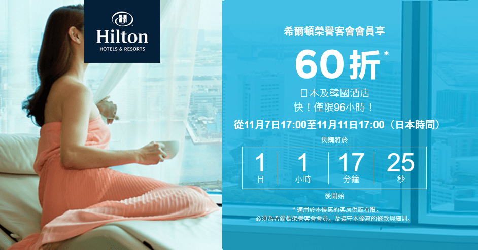 限時96小時!明年4月17日前入住!希爾頓Hilton日本韓國酒店6折優惠,明天4pm開搶! (優惠至11月11日4pm)