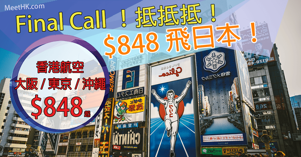 Final Call!抵抵抵!$848飛日本!包20kg行李!大阪、東京、沖繩$848起 – 香港航空 (優惠至11月10日6pm)