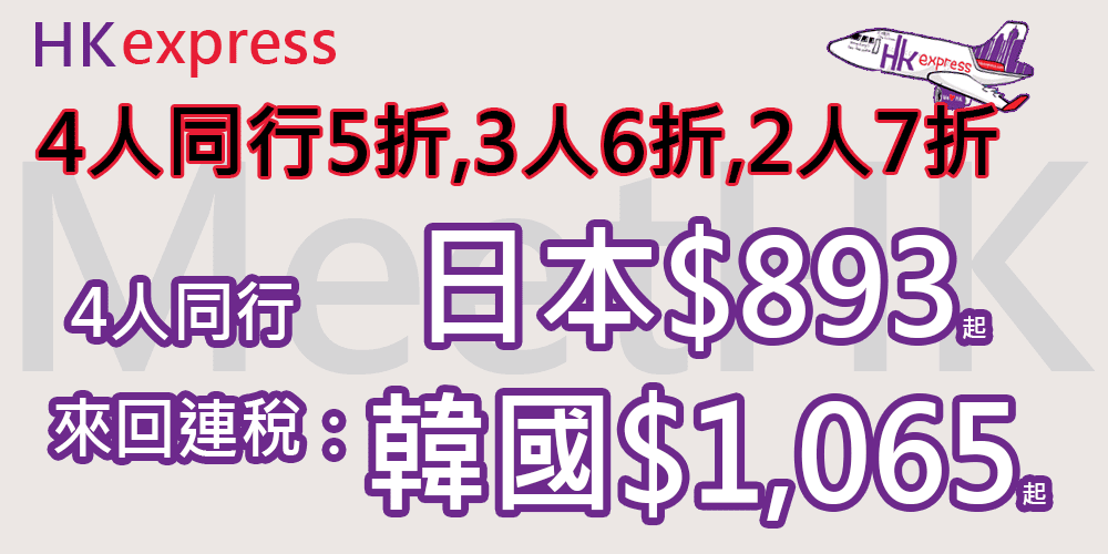 HK Express 今晚12點推出最高5折同行優惠!四人或以上5折、三人同行6折、二人同行7折