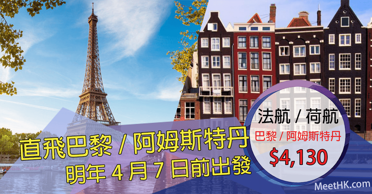 明年4月7日前出發!香港直航往返巴黎、阿姆斯特丹連稅只需$4,130 – 法國航空/荷蘭皇家航空 (優惠至1月4日)