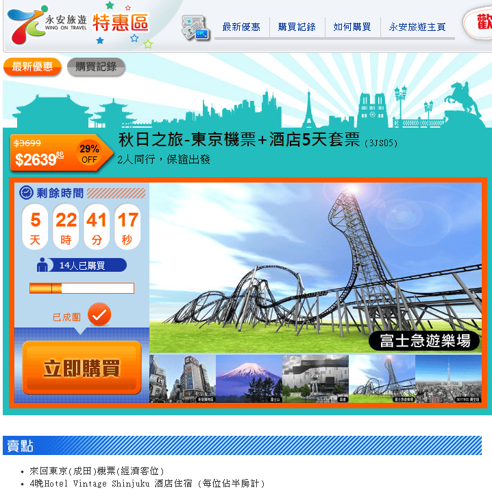 近日另一旅行社永安旅遊都推出全新網上特惠區,頭炮黎個東京五天套票優惠