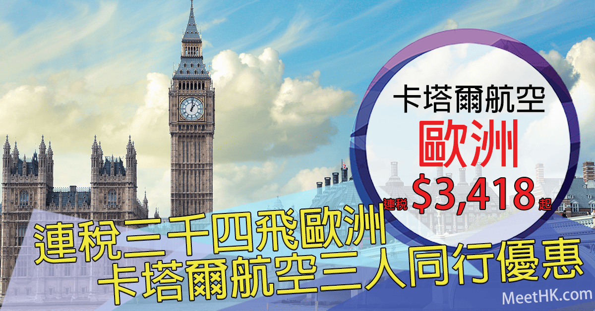 抵呀!連稅三千四飛歐洲!6月15日前出發!香港往返歐洲各地三人同行每人連稅只需$3,418起 – 卡塔爾航空 Qatar Airways (優惠至12月5日)