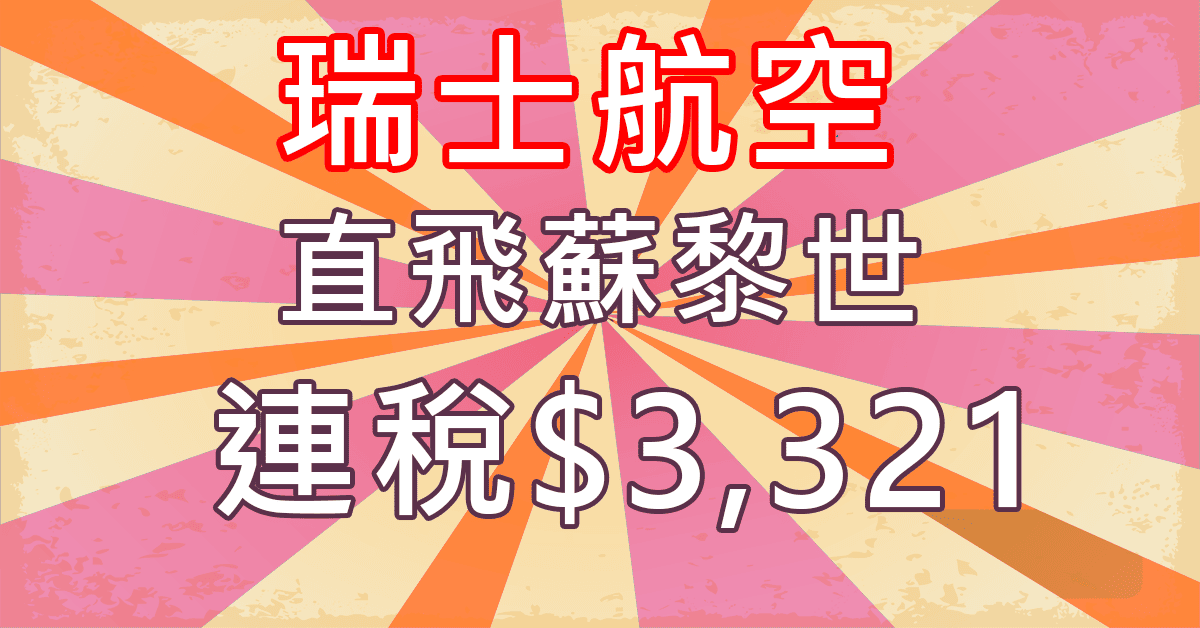 勁平!連稅三千三直飛蘇黎世!12月出發!香港直航往返蘇黎世連稅只需$3,321 – 瑞士航空 (優惠至12月5日)