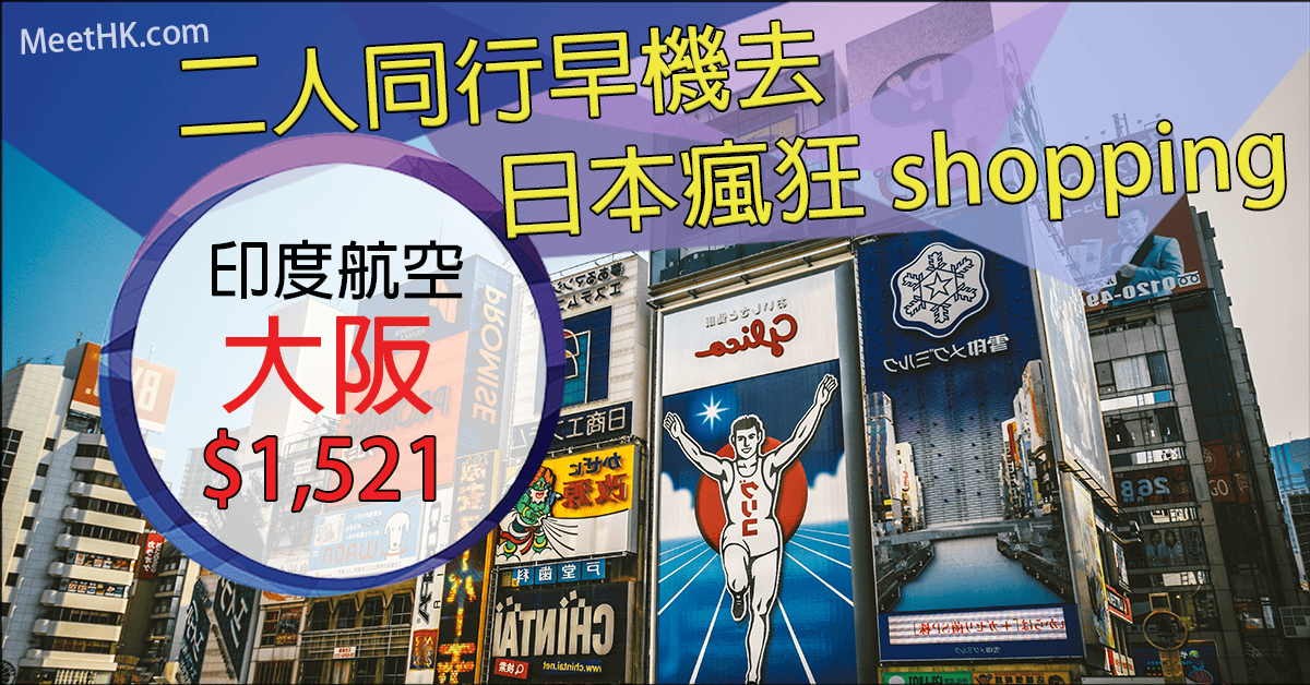 大阪都平!早機出發!香港往返大阪二人同行每人只需$1,521 – 印度航空 (優惠至1月31日)