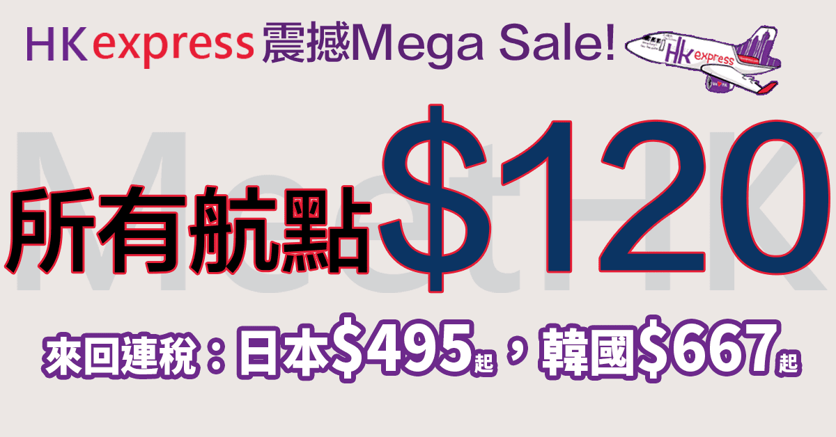 嘩嘩嘩!全線$120 Mega Sale!今晚12點必搶!所有航點單程只需$120 – HK Express (優惠至12月12日)