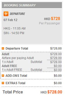 我們選了2012年2月7日香港往新加坡為例,機票價格為 $728 (包稅),二人同遊,一人付費,即每人只需 $364 很超值