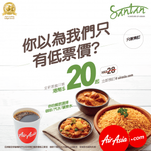 搭AirAsia不妨訂埋Santan飛機套餐,低至$20起,平絕所有廉航,仲有唔同地方既美食可以揀,預先訂購仲有飲品送