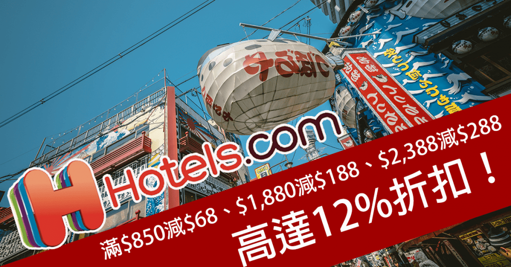高達12%折扣!Hotels.com網上酒店預訂滿$850減$68、$1,880減$188、$2,388減$288折扣優惠代碼 (4月30日前入住)