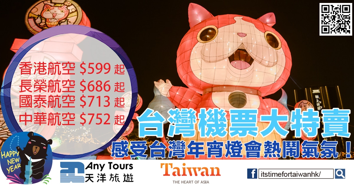 感受台灣年宵燈會熱鬧氣氛!港航飛台北$599,長榮飛台北$686,華航飛台灣$752起,國泰飛台灣$713起 – Any Tours天洋旅遊