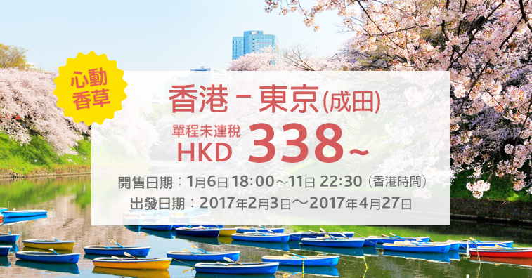 香港飛東京成田單程只需$338起,來回連稅$1,034起,價錢都唔錯