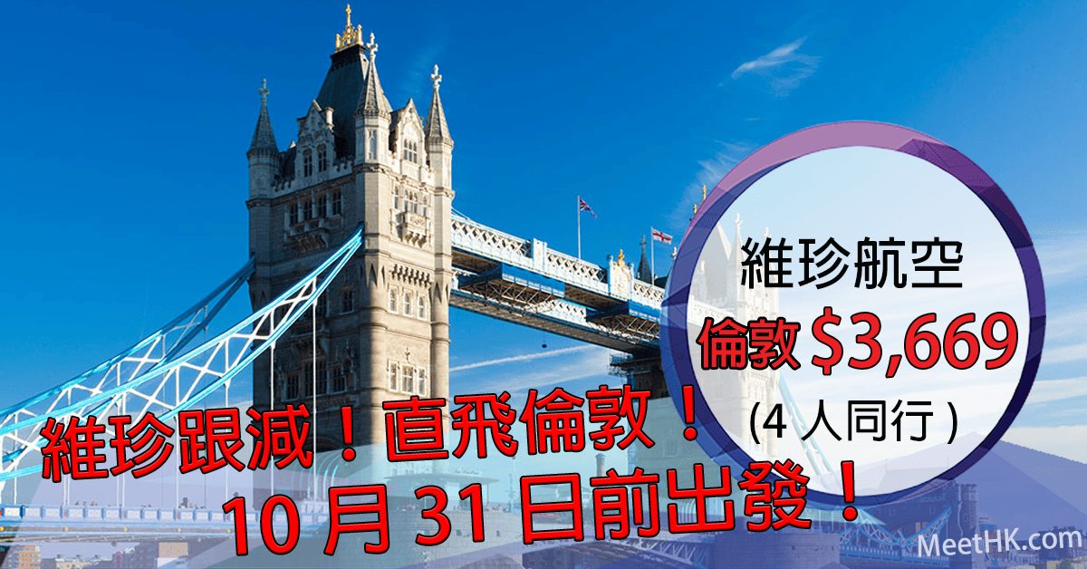 維珍跟減!直飛倫敦!10月31日前出發!香港直航往返倫敦4人同行每人只需$3,669 – 維珍航空 (優惠至2月6日)