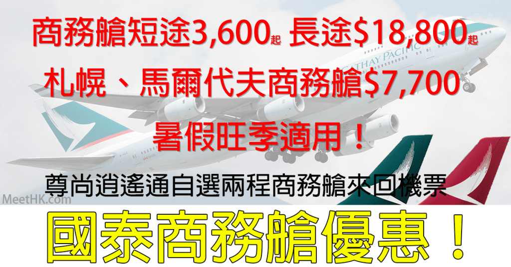 國泰商務艙優惠!暑假旺季適用!尊尚逍遙通自選2程機票組合商務艙每程來回$3,600起(短途),$18,800起(長途) – 國泰/港龍航空 (優惠至1月26日)