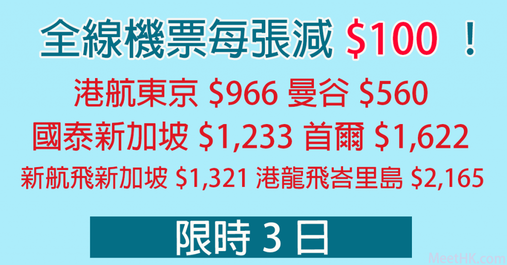 全線機票每張減$100!港航飛東京$966、曼谷$560;國泰飛新加坡$1,233、首爾$1,622起,新航飛新加坡$1,321,港龍飛峇里島$2,165 – GoGoGo!(優惠至1月13日)