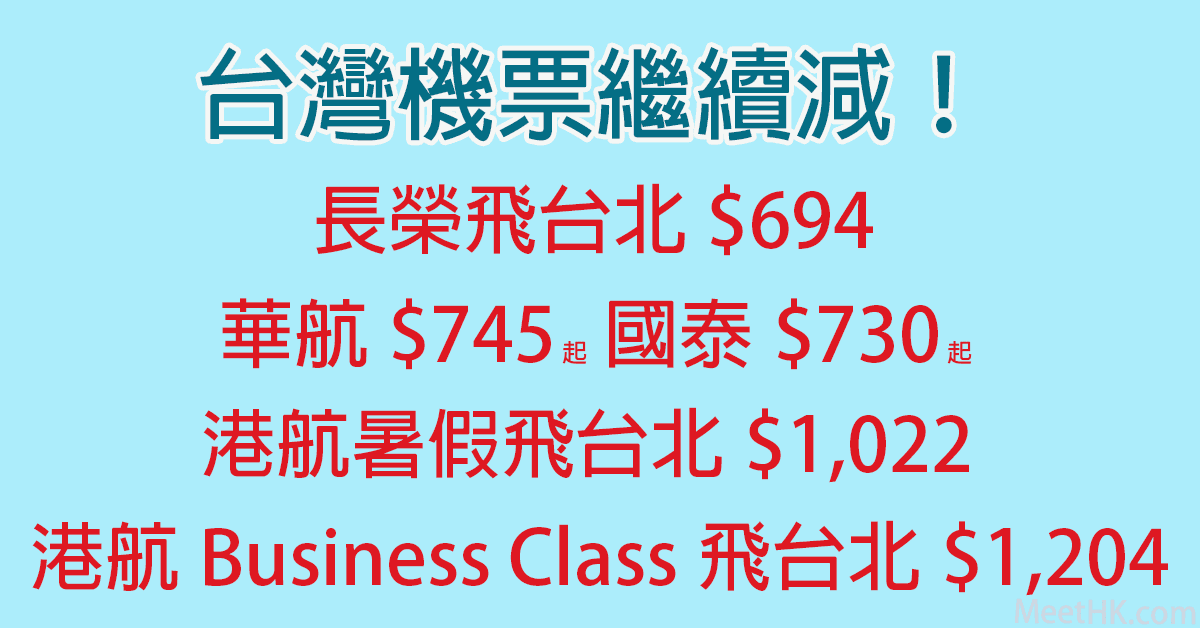 台灣機票繼續減!長榮飛台北$694,華航飛台灣$745起,國泰飛台灣$730起,港航暑假飛台北$1,022,港航Business Class飛台北$1,204 – Wefly.com.hk (優惠至1月18日)
