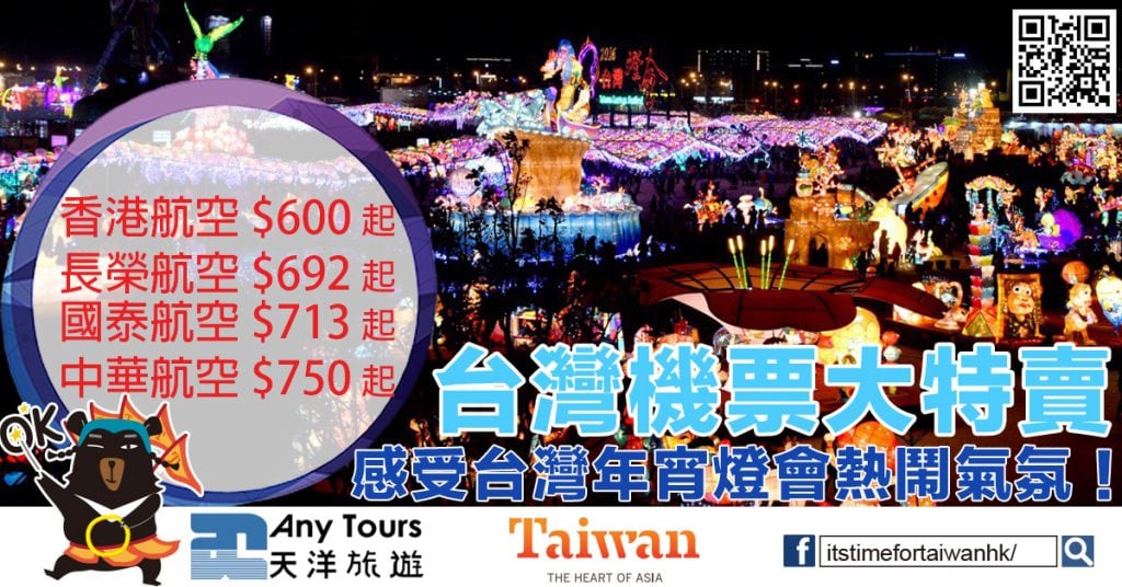 感受台灣年宵燈會熱鬧氣氛!港航飛台北$600,長榮飛台北$692,華航飛台灣$750起,國泰飛台灣$713起 – Any Tours天洋旅遊