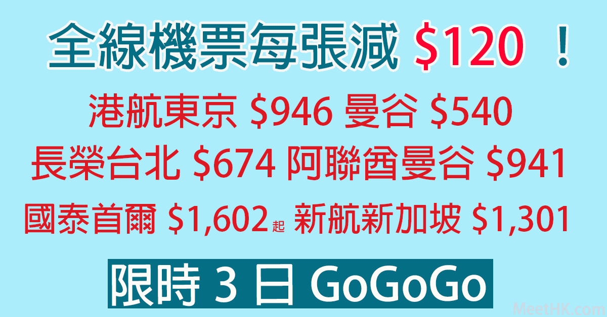GoGoGo!推出左限時3日全線機票每張減$120優惠減左$120後: