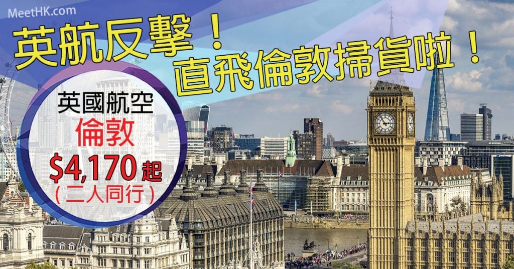 英航反擊!10月31日前出發!香港直航往返倫敦二人同行每人只需$4,170 – 英國航空 (優惠至2月6日)