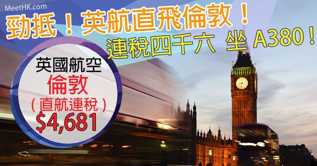 英國航空推出左新優惠,香港直航往返倫敦只需$3,251,連稅$4,681