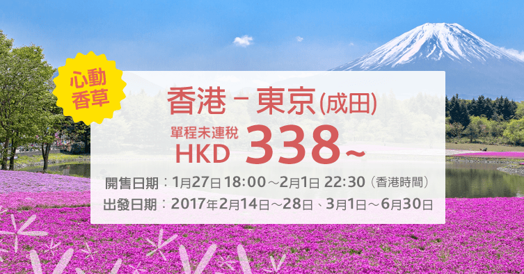 香港飛東京成田單程只需$338起,來回連稅$1,034起,價錢都唔錯