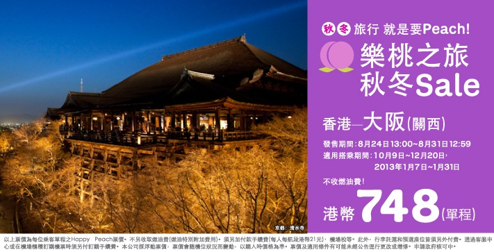 開賣啦! 樂桃秋冬優惠 香港往返大阪單程只需$748 (不另收燃油費) – 樂桃航空 (優惠至8月31日12:59pm)