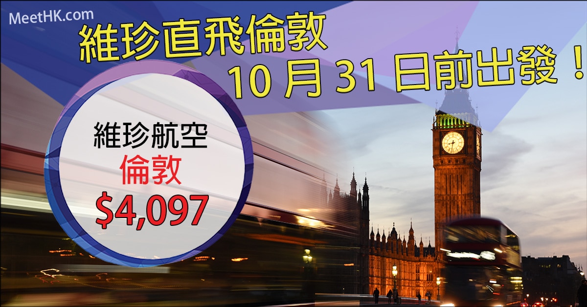 維珍都減!10月31日前出發!香港直航往返倫敦二人同行每人只需$4,097 – 維珍航空 (優惠至2月6日)