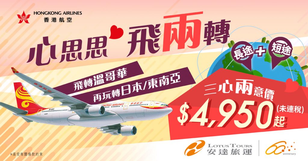 安達旅運Lotus Tours推出左香港航空勁抵玩1+1機票組合優惠