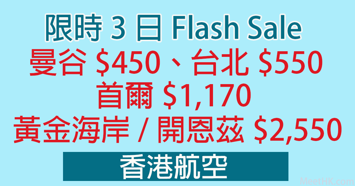 限時3日!香港往返台北只需$550,曼谷$450,首爾$1,170,黃金海岸/開恩茲$2,550,河內$570 – 香港航空 (優惠至2月8日)
