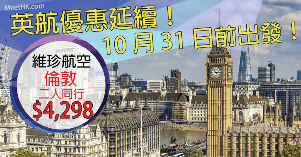 英航優惠延續!10月31日前出發!香港直航往返倫敦二人同行每人只需$4,298 – 英國航空 (優惠至2月28日)