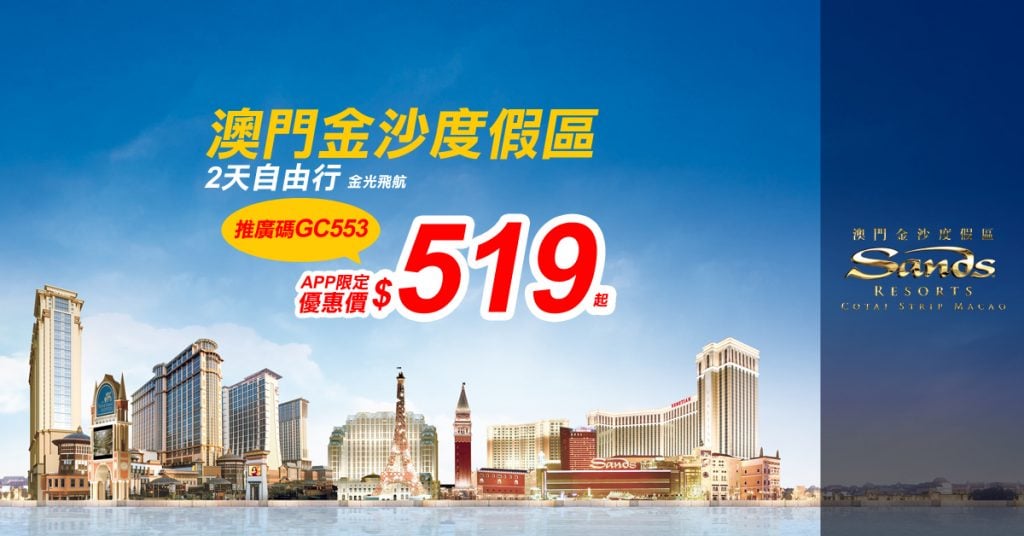 抵玩澳門套票!澳門2日1夜套票(酒店連船飛)每人只需$509起,喜來登金沙城$576起,澳門巴黎人$671起,康萊德酒店$721起 – 永安旅遊 (優惠至2月23日)