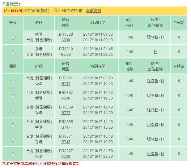 不過我地係GDS訂票系統check過,BR828同BR810暫時只開放到10月28日既機位出來,之後日子既位暫時仲未開放出來賣