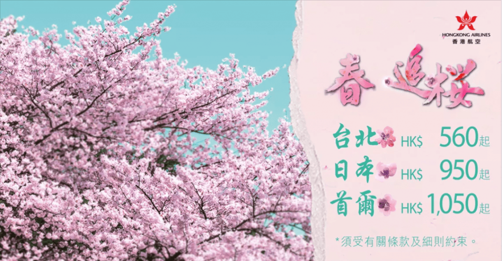 日韓台賞櫻優惠!香港往返台北只需$560,日本$950起,首爾$1,050 – 香港航空 (優惠至3月3日)