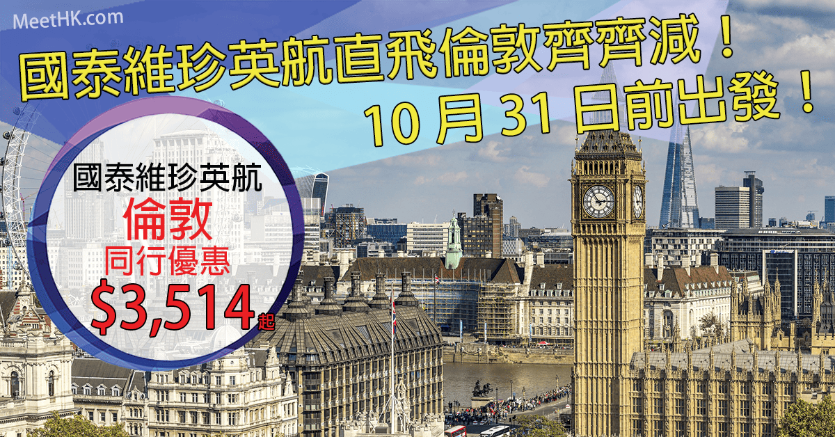 國泰維珍英航直飛倫敦齊齊減!10月31日前出發!同行優惠!香港直航往返倫敦只需$3,514起 – Wefly.com.hk (優惠至2月19日)