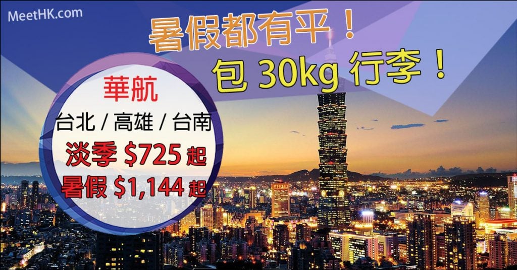 至於暑假旺季出發,華航飛台北/高雄/台南來回只需$1,144起,連稅$1,519起