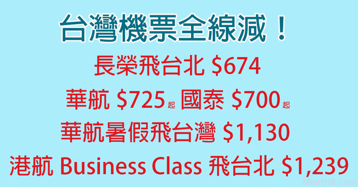 台灣機票全線減!長榮飛台北$674,華航飛台灣$725起,國泰飛台灣$700起,華航暑假飛台灣$1,130,港航Business Class飛台北$1,239 – Wefly.com.hk (優惠至2月22日)
