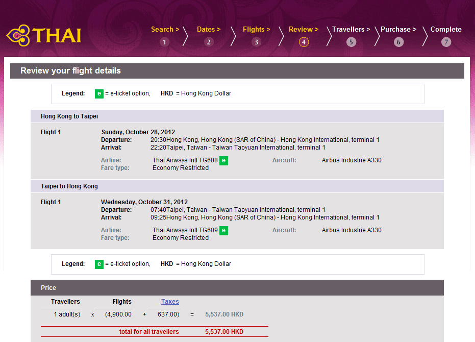 但係泰航將會係10月28日起復飛返呢條香港-台北航線,我地睇返GDS訂票系統同泰航官網已經可以出飛,不過暫時未有任何優惠推出,現時連埋稅最平要$5,537