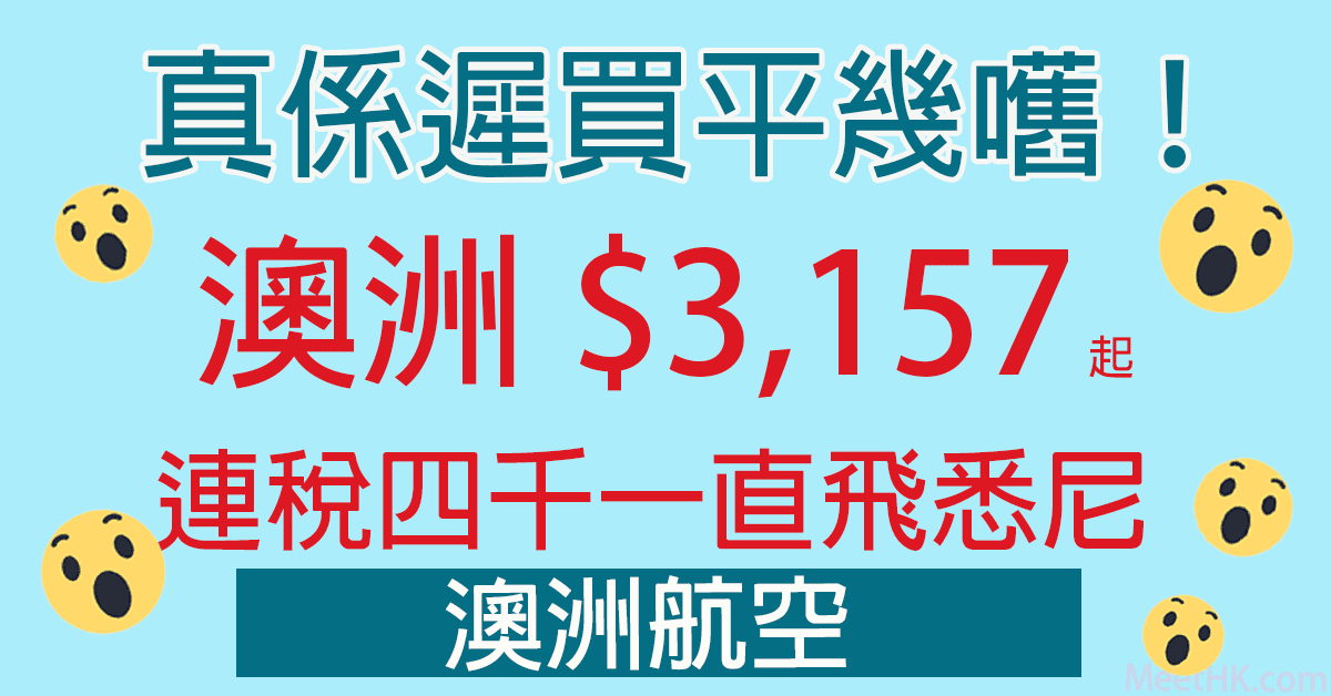 澳洲航空香港直飛悉尼來回只需$3,157起,連稅$4,158,比之前優惠再平多三百蚊,真係遲買平幾嚿!