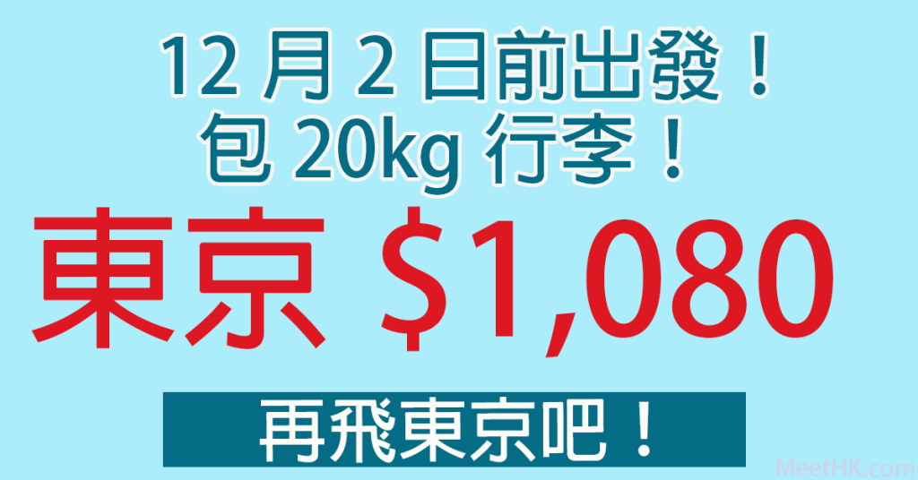 抵呀!再飛東京吧!12月2日前出發!包20kg行李!香港往返東京只需$1,080 – 香港航空
