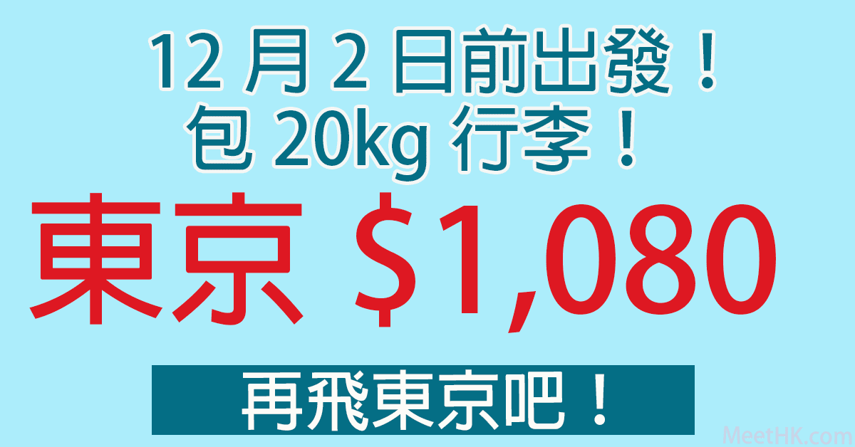 抵呀!再飛東京吧!12月2日前出發!包20kg行李!香港往返東京只需$1,080 – 香港航空