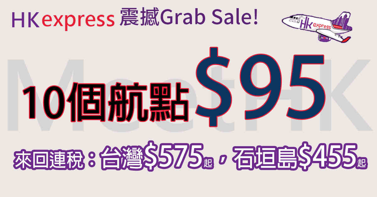 嘩!$95 Grab Sale!今晚12點開搶!10個航點單程只需$95 – HK Express (優惠至3月3日)