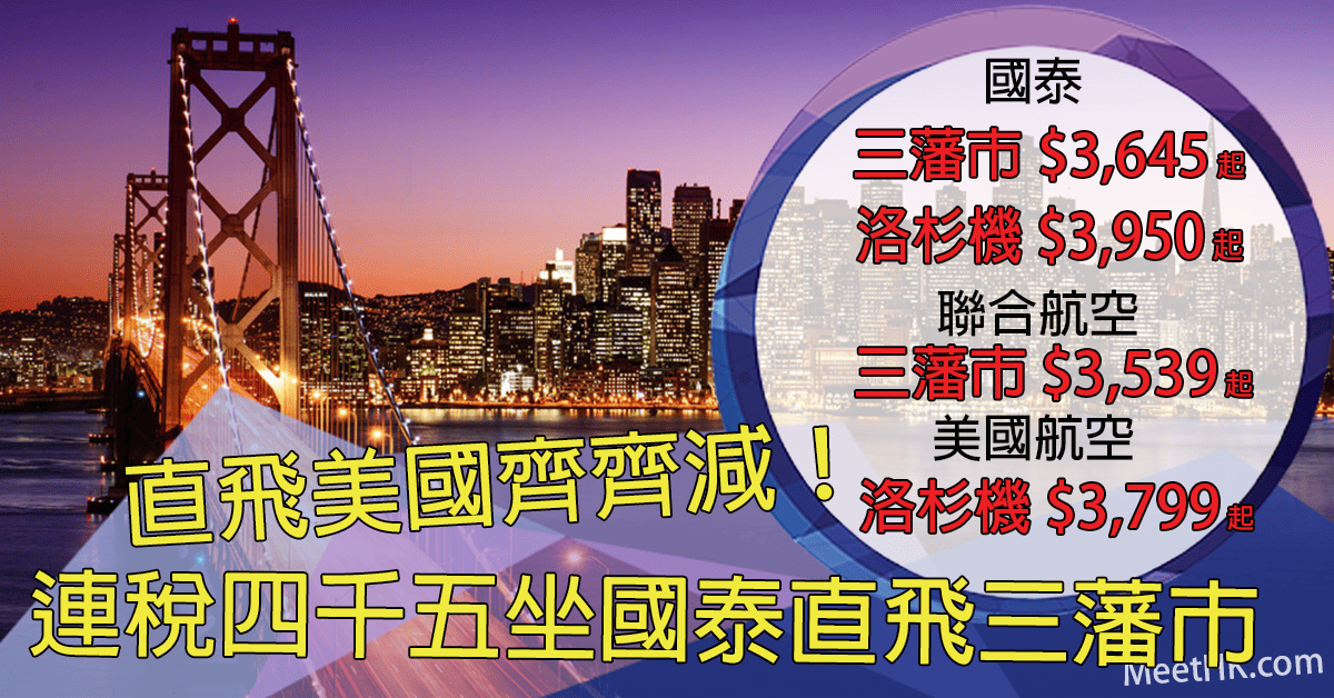 直飛美國齊齊減!國泰直飛三藩市來回$3,645起,洛杉機$3,950起;聯合航空直飛三藩市$3,539起;美國航空直飛洛杉機$3,799 – 心程旅遊 S Travel (優惠至3月31日)